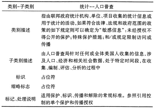 3.2 “敏感信息”的類別及子類別名稱公開 目前,美國注冊登記的22個類別分別是:農業、版權、關鍵基礎設施、緊急狀態管理、出口控制、金融、外國政府信息、地理測繪產品信息、移民、信息系統漏洞信息、情報、執法、立法、北大西洋公約組織、核、專利、隱私、所有權、安全法案信息、統計、稅收、運輸。所有上述類別及子類別均需填寫統一格式的登記表。在“敏感信息”登記的總表中,左列填寫的是類別名稱。如果有子類別,還要在下方填寫子類別的名稱,右列是類別的描述。根據13556號總統令的規定,子類別隻有在確實需要的情況下才設立。因此,有7個類別沒有子類別,分別是農業、版權、緊急狀態管理、外國政府信息、地理測繪產品信息、信息系統漏洞信息、安全法案信息。但無論有無子類別,在總表中點擊名稱,均可打開該信息的登記表。登記表的格式是完全統一的,包括名稱、描述、標識、縮略標志、標記及處理說明六個部分。以統計的子類別“人口普查”為例,點擊后打開的表格見下表。其中,具體標識及縮略語用佔位符代替,表示屬於不公開信息。