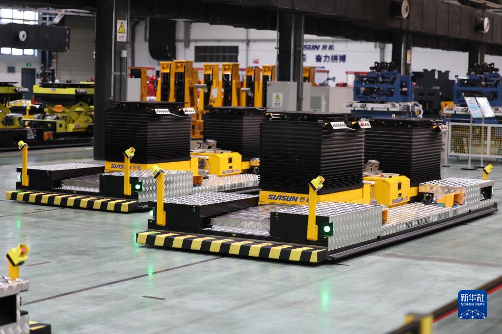 這是在沈陽新鬆機器人自動化股份有限公司拍攝的雙舉升合裝移動機器人。新華社記者 潘昱龍 攝