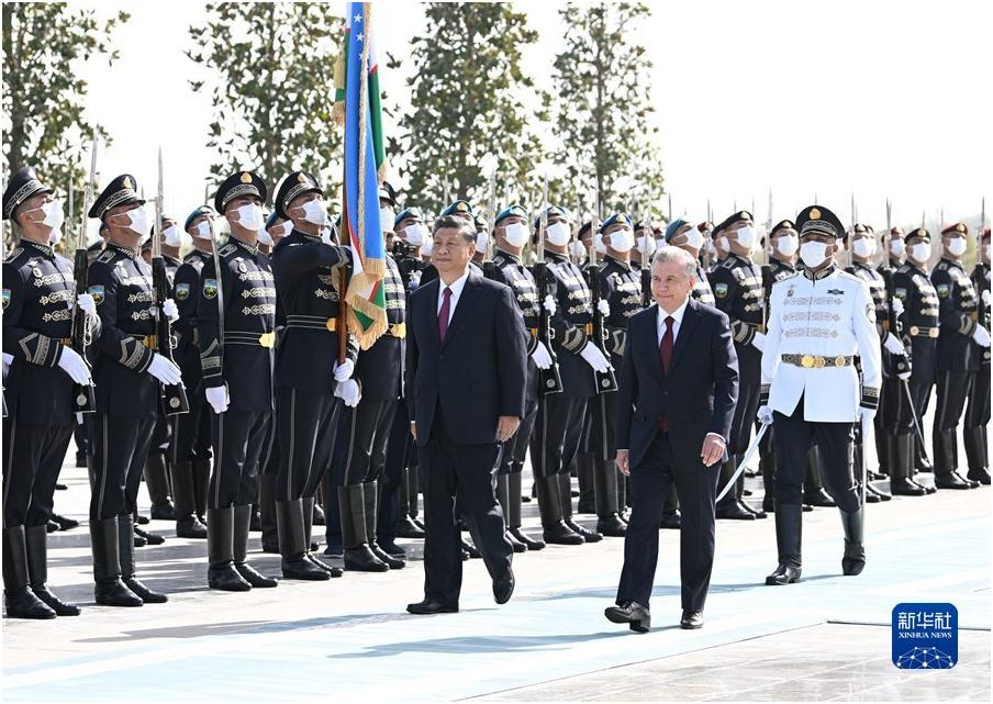 當地時間9月15日,國家主席習近平在撒馬爾罕同烏茲別克斯坦總統米爾濟約耶夫會談。會談前,米爾濟約耶夫為習近平舉行隆重歡迎儀式。新華社記者 申宏 攝