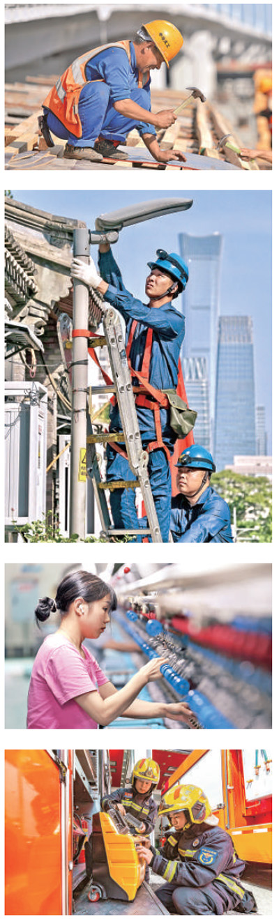 國慶假期,勞動者堅守崗位、奮戰一線。照片自上而下依次為: 河北石家庄市體育大街互通立交施工現場,工人在進行橋梁施工。 曉峰攝(新華社發) 北京城市照明管理中心的技術員在維修路燈。 新華社記者 李 欣攝 重慶黔江區正陽工業園區,一家絲綢企業的職工在車間工作。 楊 敏攝(人民視覺) 貴州安順經濟技術開發區,消防救援人員在檢查安全裝備。 陳 熙攝(新華社發) |