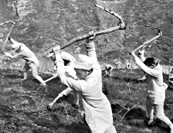 1941年前后,由于日本帝国主义的“扫荡”和国民党反动派的封锁包围及自然灾害,各抗日根据地出现了极端困难的局面。中国共产党提出“发展经济,保障供给”的方针,开展了大生产运动。图为晋察冀边区的八路军指战员在开荒生产。 新华社发