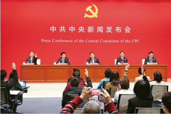 2021年11月12日,中共中央在北京举行新闻发布会,介绍党的十九届六中全会精神,并答记者问。 中新社记者 易海菲/摄