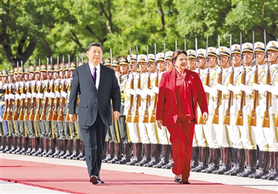 六月十二日下午,国家主席习近平在北京人民大会堂同来华进行国事访问的洪都拉斯总统卡斯特罗举行会谈。这是会谈前,习近平在人民大会堂东门外广场为卡斯特罗举行欢迎仪式。 |