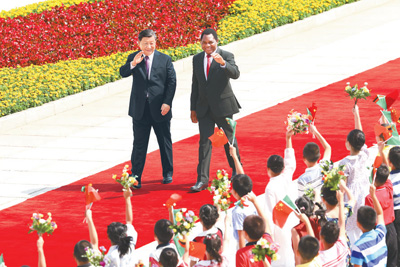 九月十五日上午,国家主席习近平在北京人民大会堂同来华进行国事访问的赞比亚总统希奇莱马举行会谈。这是会谈前,习近平在人民大会堂东门外广场为希奇莱马举行欢迎仪式。 新华社记者 庞兴雷摄 |