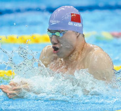 中国选手覃海洋在杭州亚运会游泳项目男子50米蛙泳决赛中获得冠军。