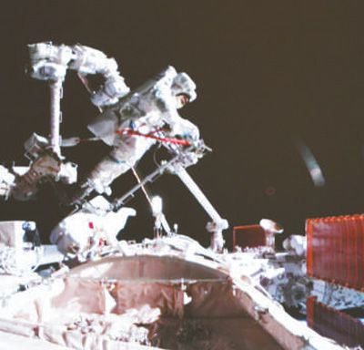 在北京航天飞行控制中心拍摄的神舟十六号航天员景海鹏(上)、朱杨柱开展舱外操作的画面。