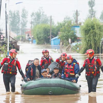 在黑龙江省尚志市一面坡镇万山村,消防员将被困群众转移至安全地域。