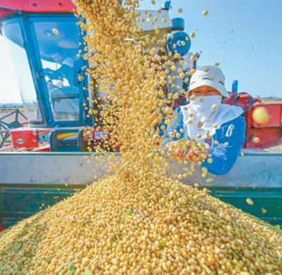 河南省洛阳市孟津区会盟镇下古村农民收获大豆。