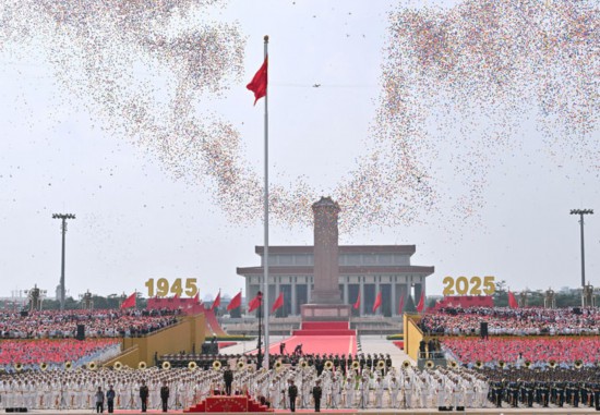 2025年9月3日,纪念中国人民抗日战争暨世界反法西斯战争胜利80周年大会在北京隆重举行。这是纪念大会现场放飞气球。新华社记者 李贺 摄
