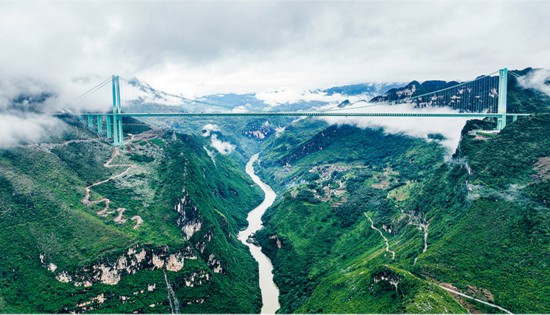 “十四五”时期,我国综合立体交通网主骨架“6轴7廊8通道”加速完善,基础设施网络更加系统完备。2025年9月28日,贵州花江峡谷大桥建成通车。大桥全长2890米,主跨径1420米,是目前世界山区峡谷第一大跨度钢桁梁悬索桥;其桥面距水面垂直高度625米,是新的世界第一高桥。图为9月26日拍摄的贵州花江峡谷大桥。 新华社记者 欧东衢/摄