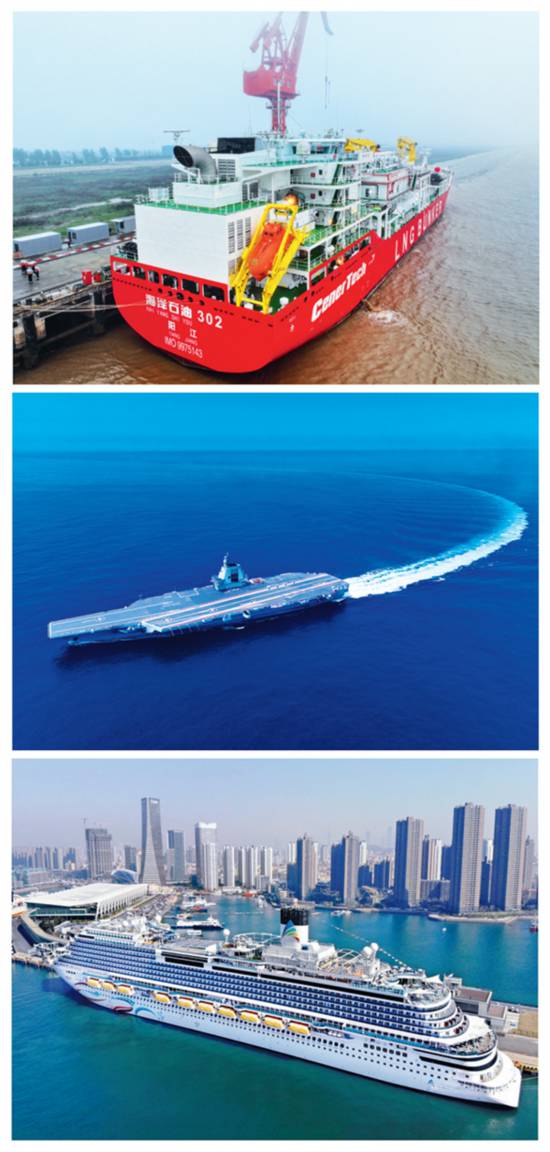 “十四五”时期,我国不断站上一个又一个大国重器的创新制高点,在船舶制造领域就集齐了船舶工业皇冠上的“三颗明珠”。上图为2024年4月28日,国内首艘12000立方米LNG运输加注船“海洋石油302”在江苏启东海工船舶工业园中集太平洋海工码头顺利交付(中新社图片 许丛军/摄);中图为2024年5月7日,我国第一艘国产电磁弹射航母福建舰在首航试验中(新华社图片 丁子羽/摄);下图为2025年4月6日,我国首艘国产大型邮轮“爱达·魔都号”靠泊青岛国际邮轮母港,正式拉开爱达邮轮中国海岸巡游的序幕(新华社图片 李紫恒/摄)。