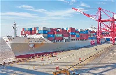 图为靠泊上海洋山港的“钱凯—上海”海运航线船舶。 |