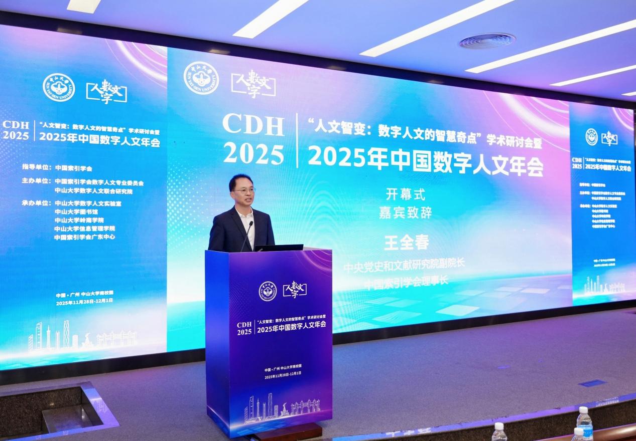 2025年11月28日至11月30日,“人文智变:数字人文的智慧奇点”学术研讨会暨2025年中国数字人文年会在中山大学召开。本次年会由中国索引学会指导,中国索引学会数字人文专业委员会和中山大学数字人文联合研究院主办。中央党史和文献研究院副院长、中国索引学会理事长王全春,中山大学党委书记刘承功出席开幕式并致辞。