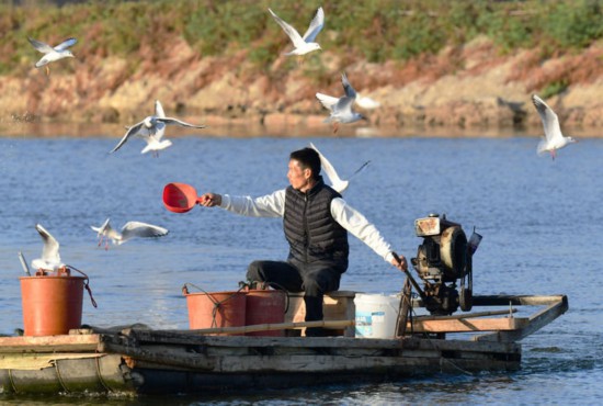 2025年12月10日,福建省漳州市佛昙镇东坂村河豚养殖户在给河豚投喂食物。新华社记者 魏培全 摄