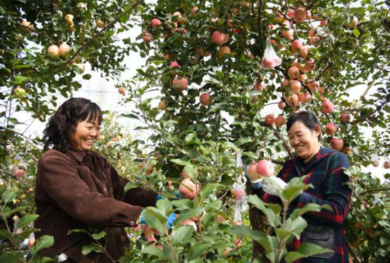2025年10月17日,果农在陕西省延安市宝塔区桥沟街道烟洞沟村采收苹果。新华社记者 张博文 摄