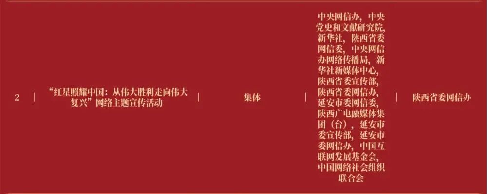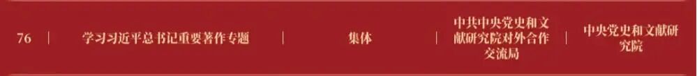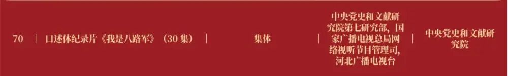其中,中央党史和文献研究院参与创作的“‘红星照耀中国:从伟大胜利走向伟大复兴’网络主题宣传活动”入选“2025中国正能量十佳网络精品·网络正能量主题活动”;第七研究部等创作的“口述体纪录片《我是八路军》”入选“2025中国正能量网络精品·网络正能量音视频”,“‘百年辉煌 知史爱党’全国党史短视频征集展播活动”和“‘理响中国’理论融媒体精品征集展播活动”入选“2025中国正能量网络精品·网络正能量主题活动”;对外合作交流局创作的“学习习近平总书记重要著作专题”入选“2025中国正能量网络精品·网络正能量专题专栏”。